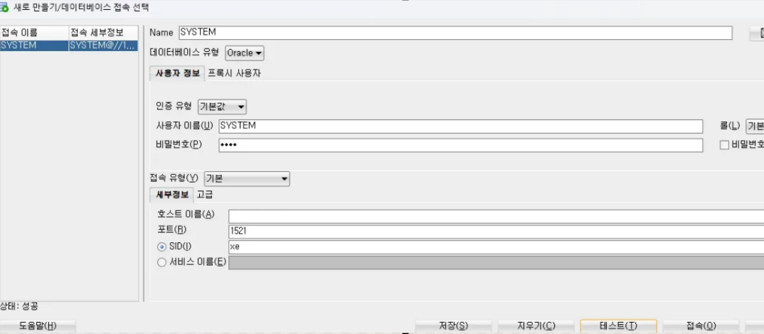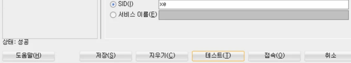 하단에 테스트를 클릭하면 접속 테스트를 실행할 수 있다.