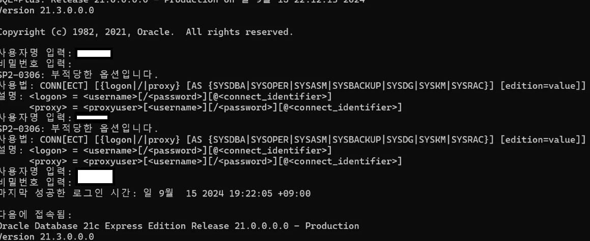 처음에 부적당한 옵션입니다. 라는 문구가 떠서 당황했으나, 검색해보니 비밀번호에 특수문자가 포함된 경우 이런 에러를 접할 수 있다고 한다.