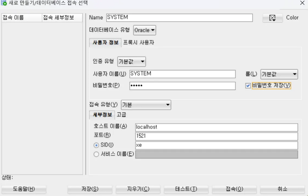 - 초반에 오라클 설치할 당시 설정했던 ID & PASSWORD 로 접속